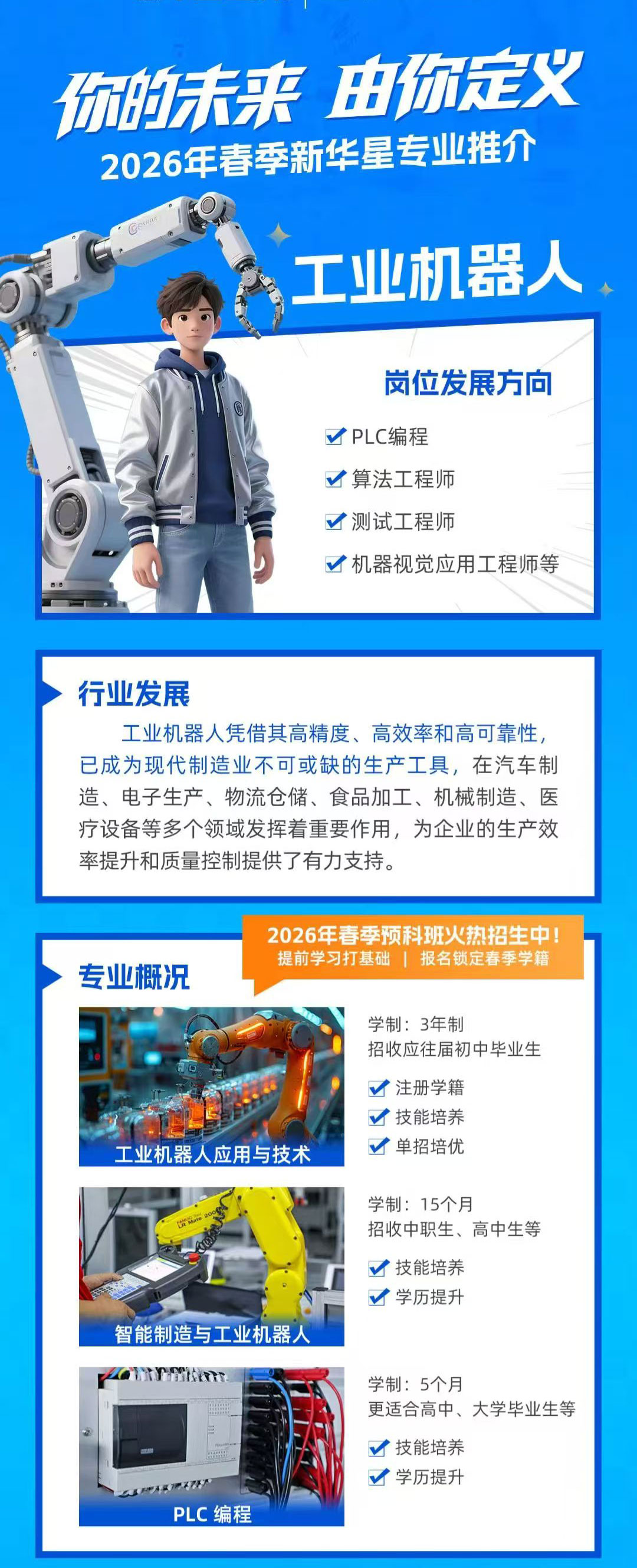 工业机器人岗位发展方向 PLC编程 算法工程师 测试工程师 机器视觉应用工程师等 工业机器人行业发展 工业机器人凭借其高精度、高效率和高可靠性已成为现代制造业不可或缺的生产工具,在汽车制造、电子生产、物流仓储、食品加工、机械制造、医疗设备等多个领域发挥着重要作用,为企业的生产效率提升和质量控制提供了有力支持